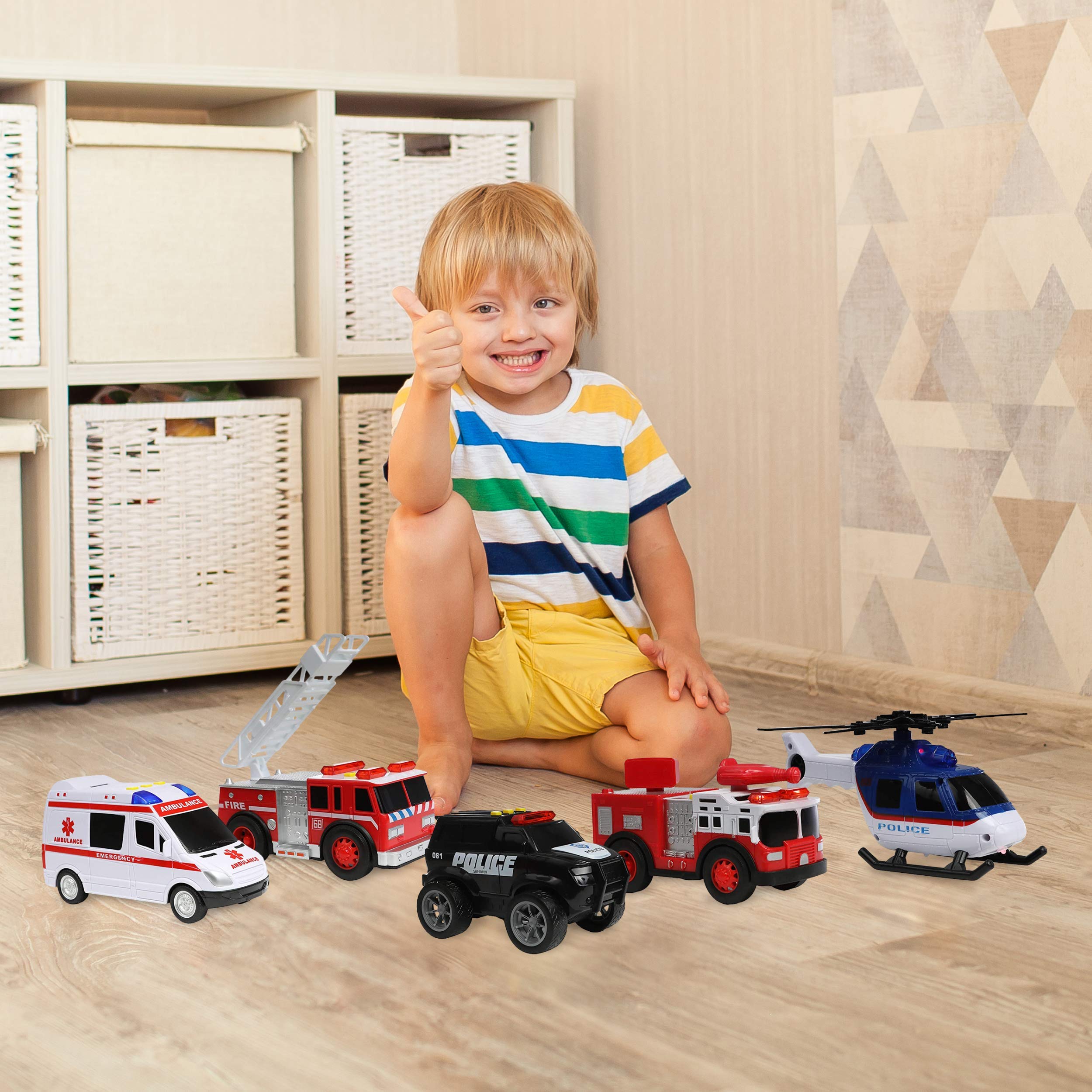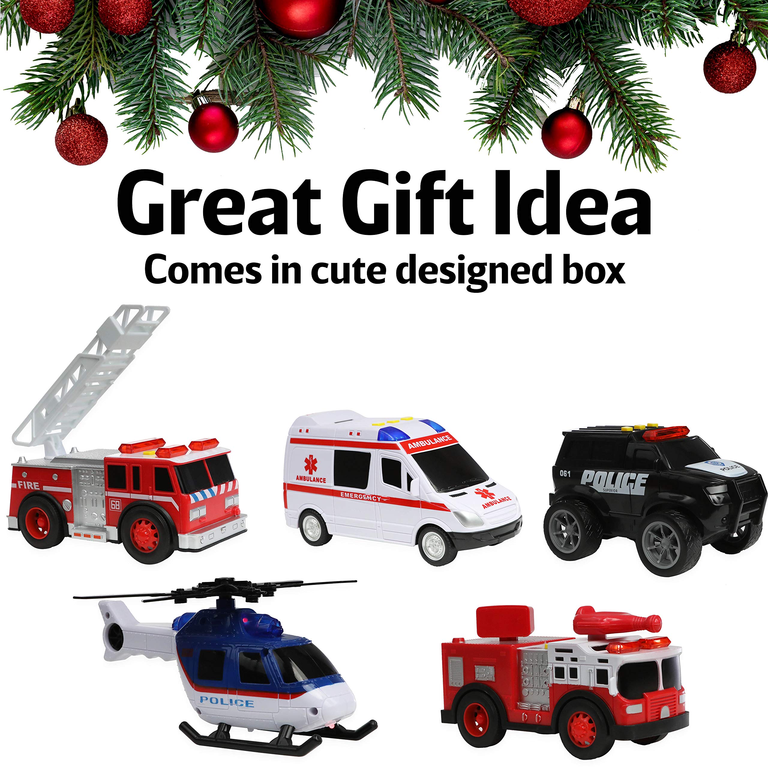 - 5 Piece Emergency Vehicles Set: Comes with a Fire Engine, Fire Truck, Ambulance, Police Car, and a Police Helicopter. Wheels are Made of Top Quality Materials and Ride Super Smoothly!