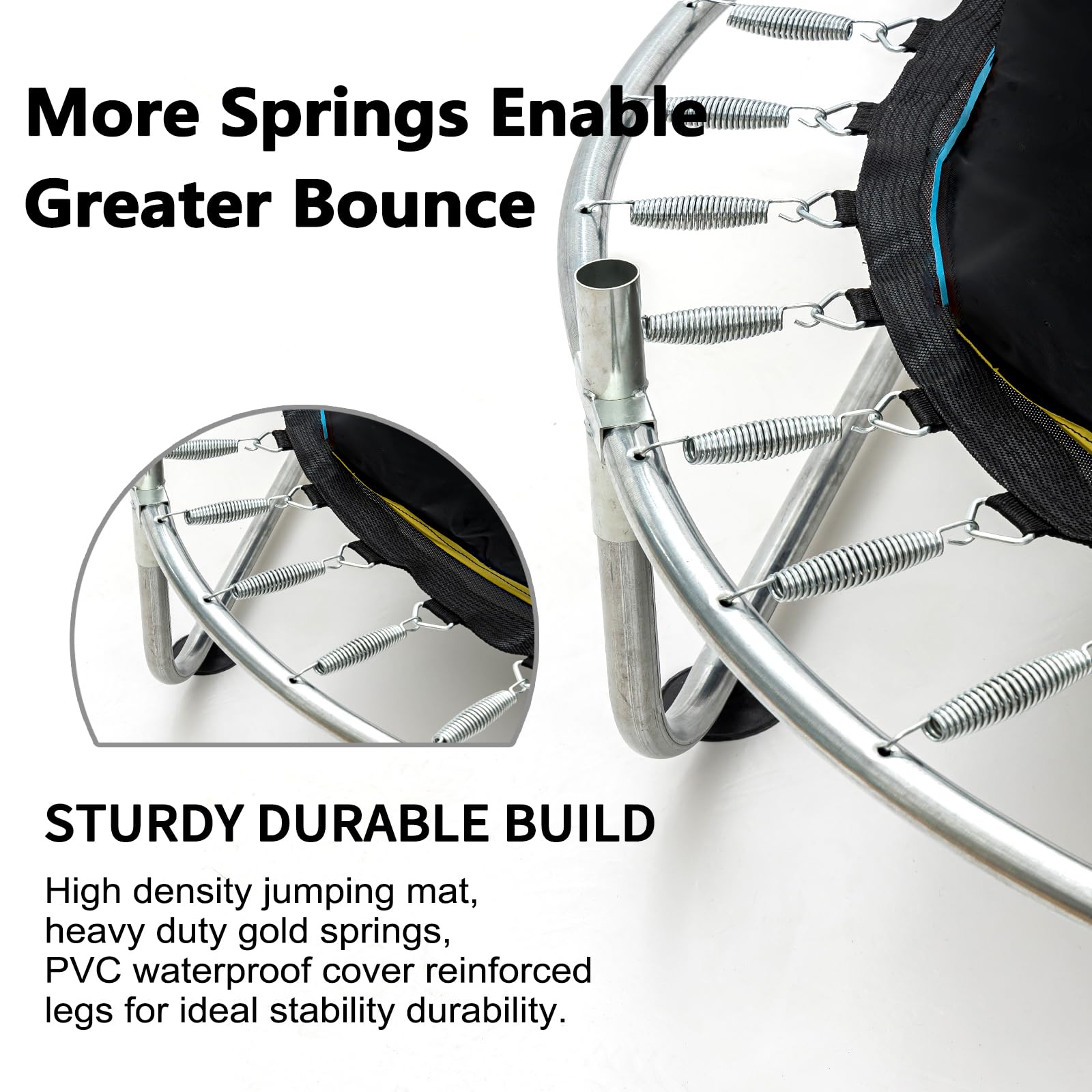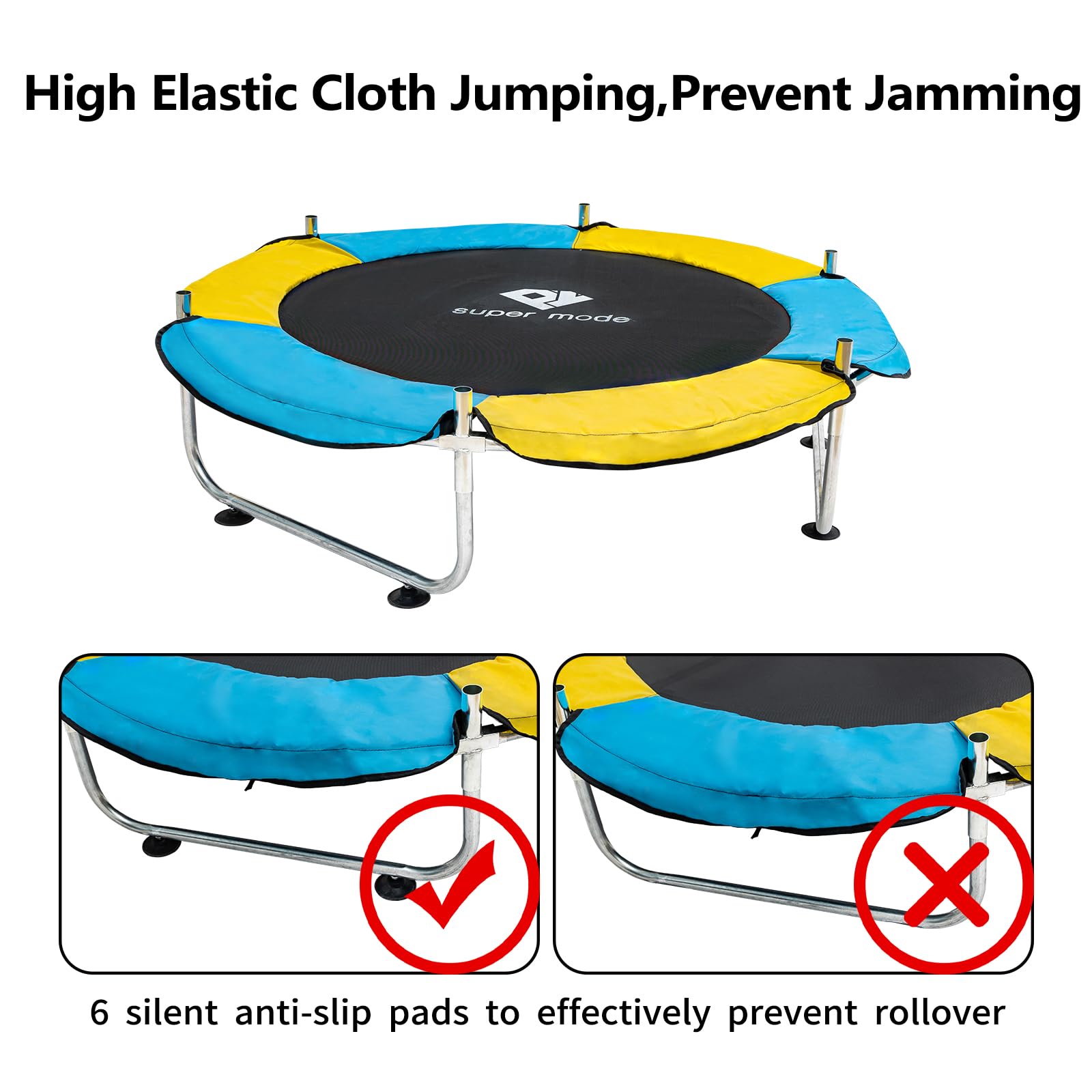 - u3010Stable & Durable Constructionu3011 Made from galvanized steel pipe inside, the baby trampoline is solid and steady enough to hold up to 440 lbs. In addition, the U-shaped feet equipped with two enhanced silent suction pads, are used to prevent rolling effectively.