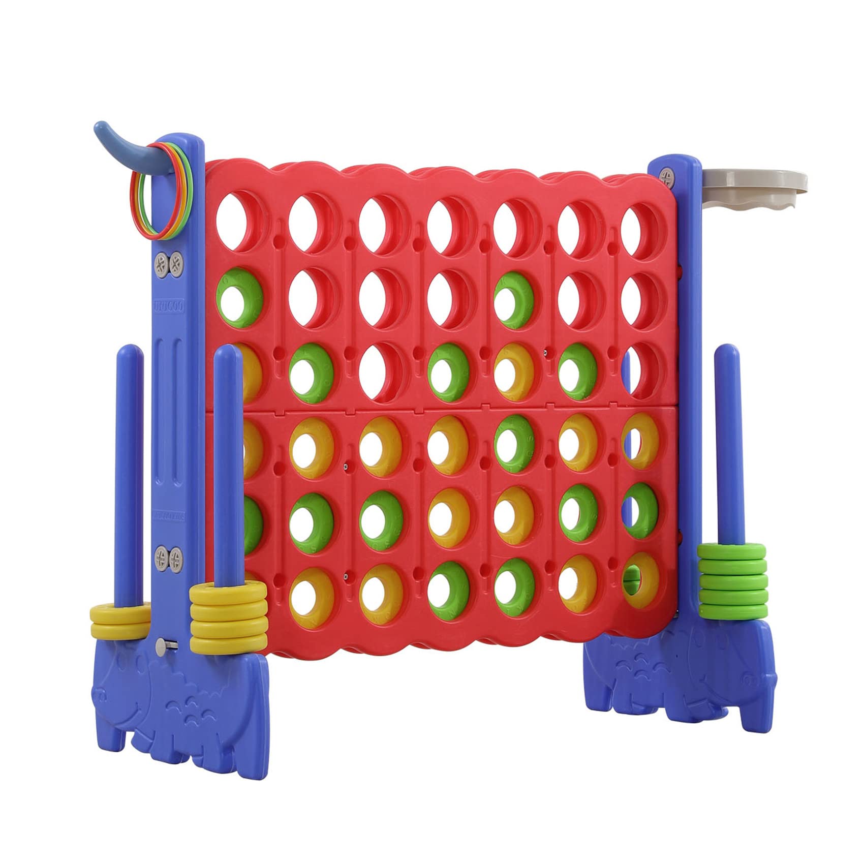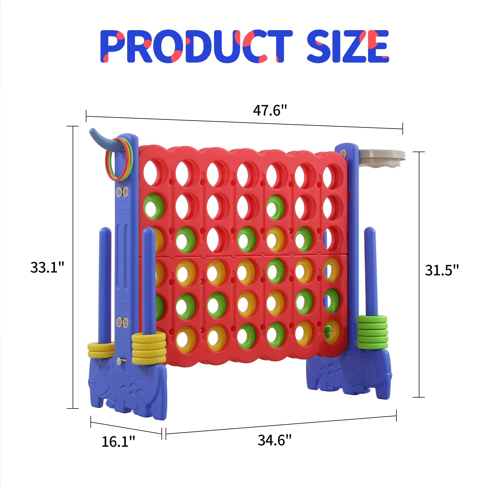 - ud83cudf1eEASY INSTALLATION & CARRY: Even children can set it up by themselves, no tools needed. Built in holders can store all the 42 rings when not play. Just pull out the lever to start a new game. Carry bag included.
