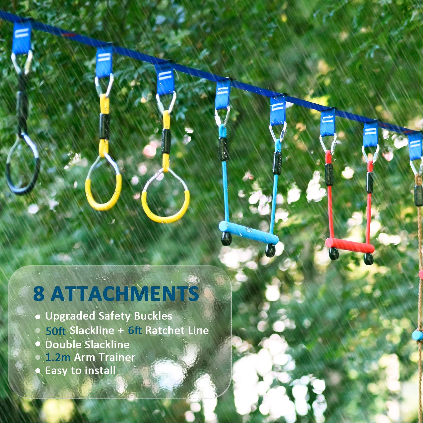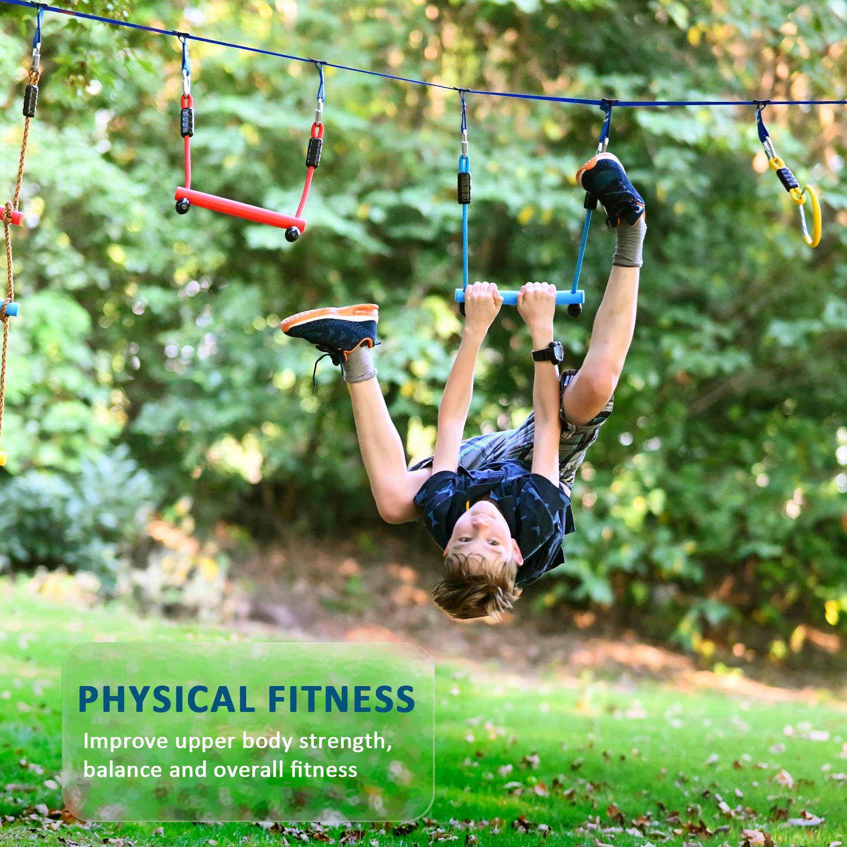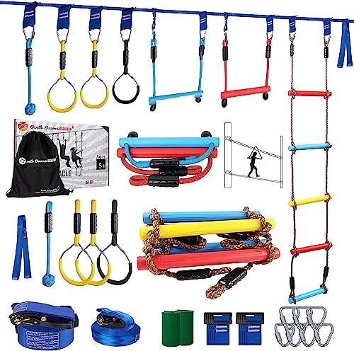 - ud83euddd78 OBSTACLES - The Ninja warrior line hanging obstacle course is quick and easy to set up, a convenient carry bag lets you take it wherever you go. Perfect for all occasions, such as outdoor birthday parties, forest camping, backyards, playground, fitness class and so on.
