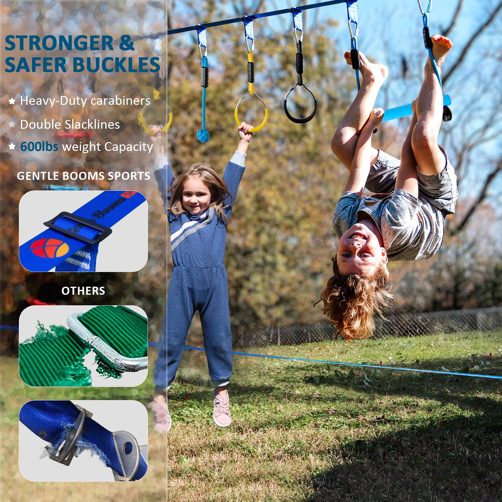 - ud83euddbfDURABLE AND SAFE - High-quality PE material and High-strength anti-rust treated steel components will last for years. Each Ninja Warrior accessory is tested for a 600-pound load capacity. We upgraded the "ONE-PIECE" and coated design buckle and solved the problem of slack line tearing.