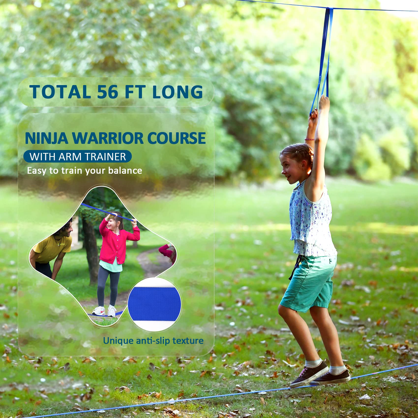 - ud83eudd0fNINJA WARRIOR FUN - Whether you're a kid or an adult, the 2u00d756 ft Ninja Slack Line is the perfect obstacle course for demanding fun and physical challenge. Build your child's confidence, coordination and strength in this healthy way to keep them entertained, get them really physical, and keep them fit throughout the year.